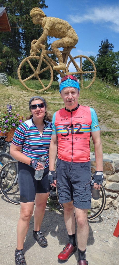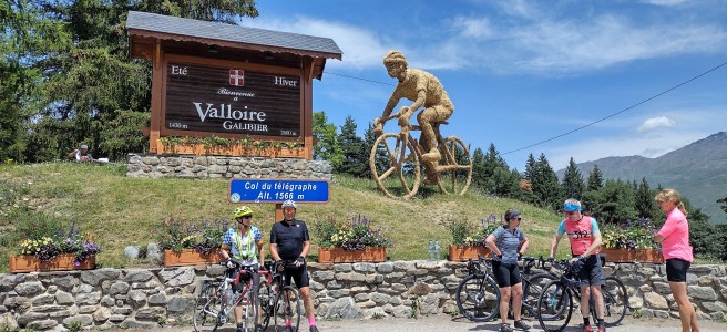 The top was a steep, endless ascent that, once the tree line had been cleared, provided a great view over the valley. After a short stop at the top for a picture, and a replication of a previous snap for John W, they rode into Valloire for some lunch. Yes, ham and cheese baguettes again, but, as they say, ‘if it ain’t broke, don’t fix it.’