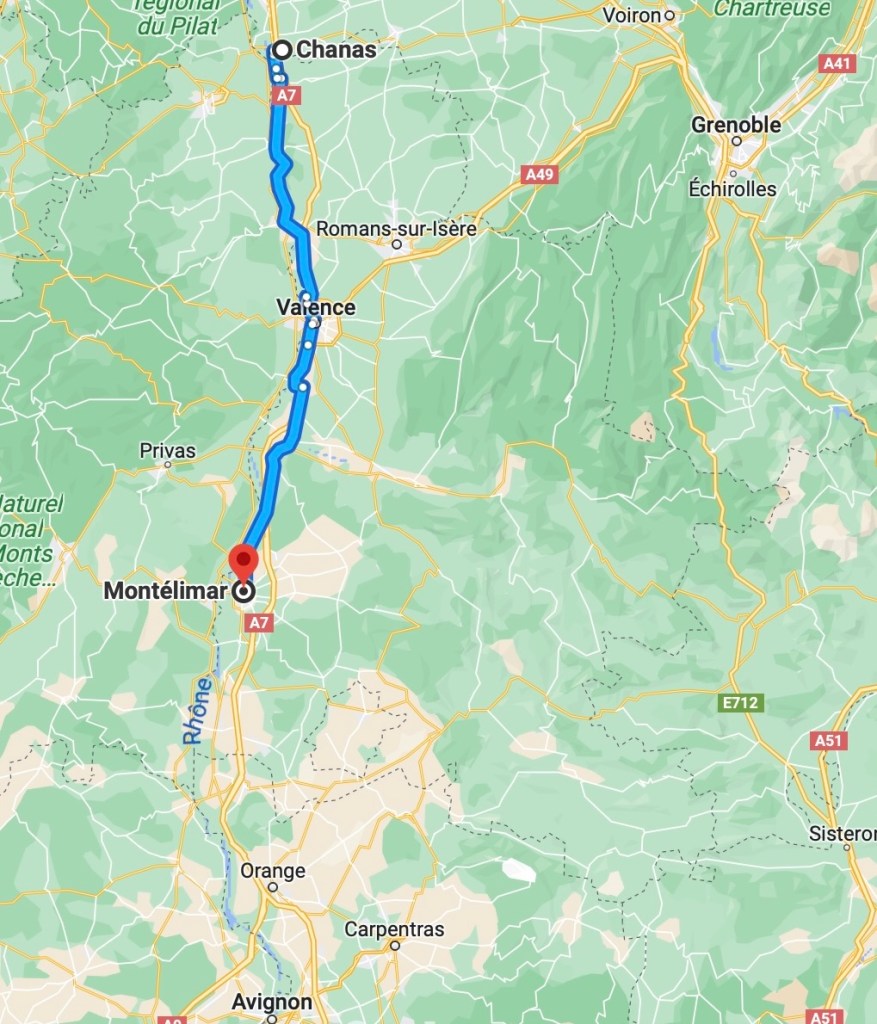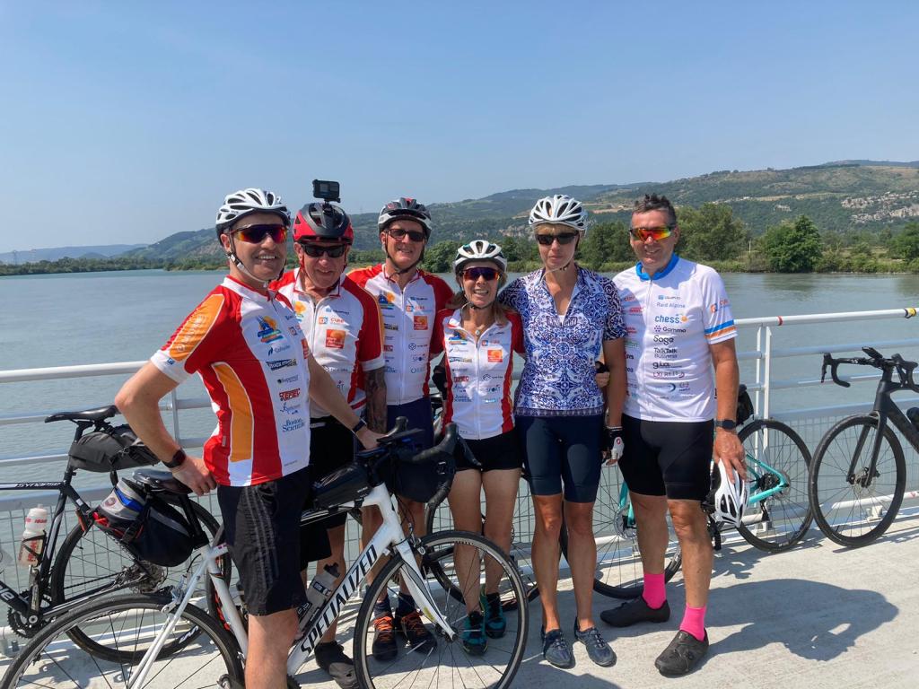Some set off early to try to beat the heat and arrive at our destination of Montelimar in record time. Those of us happy to start later enjoyed a good hotel breakfast, a few fiddly junctions and then long stretches of beautiful, riverside designated cycle ways. At around mile 25 we were looking for a suitable stop and happened upon a great boulangerie hiding behind a health centre. Just what we needed. Heading on, being blown along by the tail wind, accompanied by DJ Declan’s great playlist we soon made it to a suitable lunch stop and met the van for water and a few supplies. Just after, crossing a bridge there are kids swimming n the river and soon we see a small beach where ‘van’ Paul spots a swimming opportunity for us. We are quick to join him. The last few kilometres include wire pedestrians bridges which provide unique cycling challenges, more amazing cycle paths and a busy run-in to our destination; the town of Montelimar.