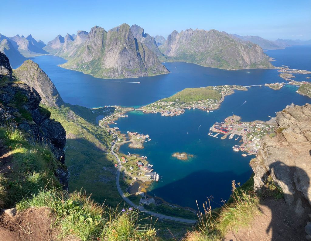 With the woes of yesterday firmly behind us, we awoke to glorious sunshine, a light, warm, breeze and plenty of enthusiasm to reassemble our bikes. This is easily done and we take them on a short test run and then make the late morning ferry to Løtofen and on to Sørvågen.