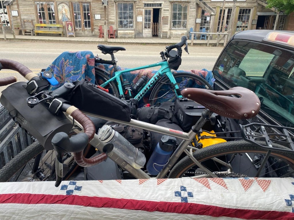 Having checked into the fabulous Fairweather Inn, I explained to the two lovely receptionists, Sherry and Becky and asked if there was anyway my bags could be transported to the top of the hill so that I could cycle up but not have to carry the weight. Absolutely they said but there would be room for my bike as well. I had a dilemma for a few short minutes but it didn’t take me long to succumb to the offer and this morning along with everyone’s panniers, Becky took myself and Julia to the meeting point just beyond the top of the hill to meet the others who had climbed it with noticeably lighter bikes. It was a win-win for all of us and a huge thanks go to Sherry and Becky for making it possible.
