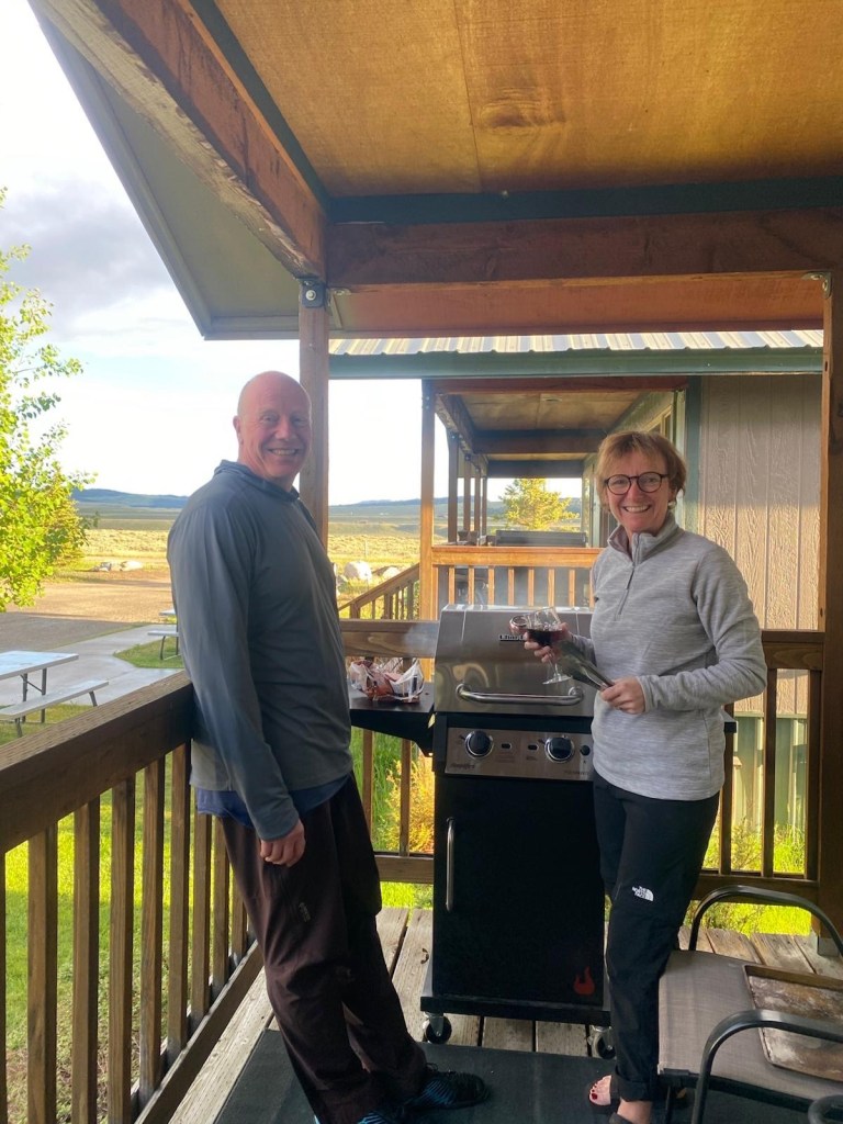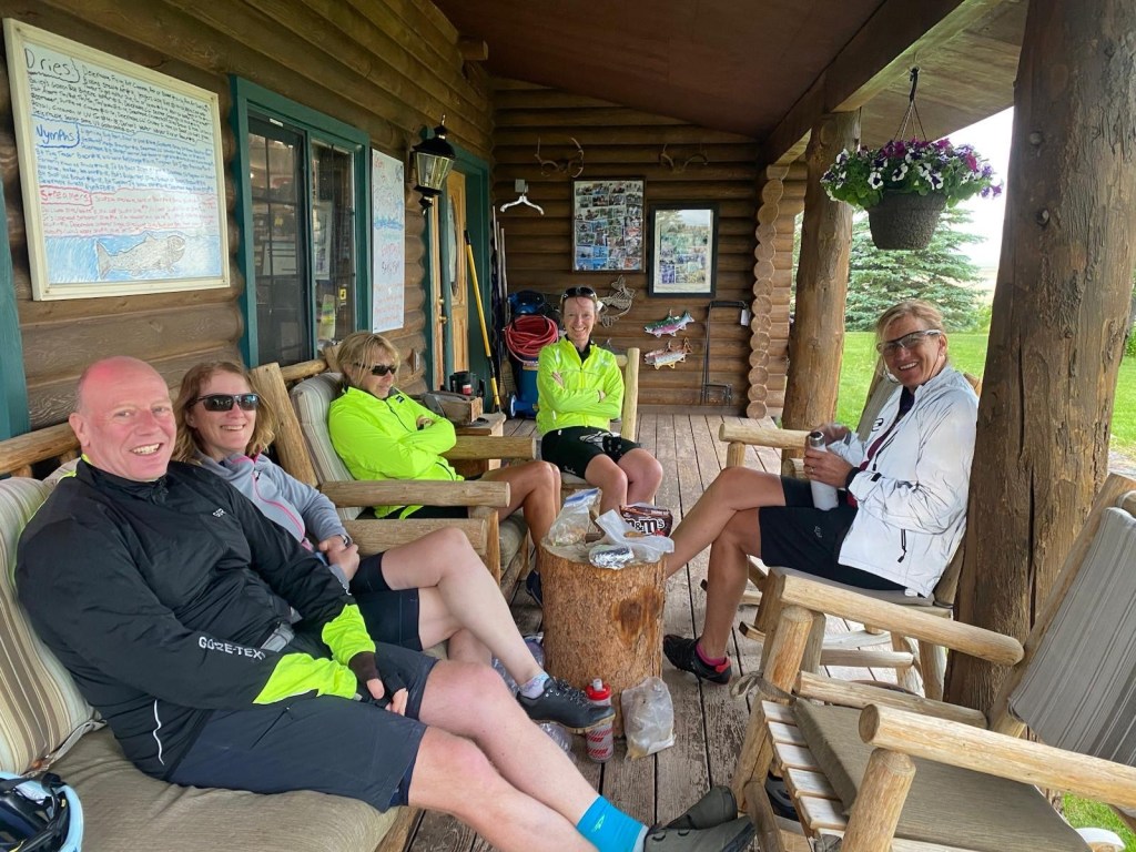 The owners of the shop could not have been more helpful and we spent a comfortable 90 minutes there waiting for the storm to pass. Taking advice from the locals we eventually set off with a significant headwind and occasional showers from the passing storm. It took us nearly two hard hours to cycle the last 16 miles to our cabin for the night and a bit longer for Caroline, Paul and John who had to fix a number of punctures within the last few miles of the day.