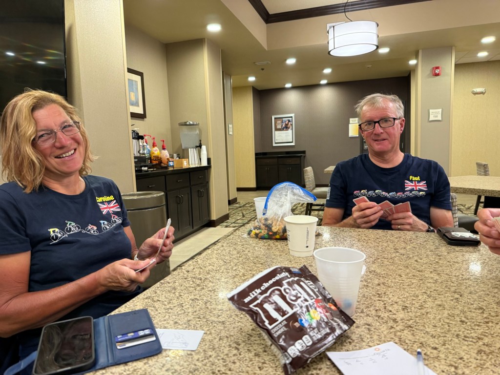 Lunch en route was a basic mix of the leftovers of each of our panniers, so an early evening meal and bottle of wine downtown in Gillette was called for. A game of cards, an early night and the luxury of a late start tomorrow.