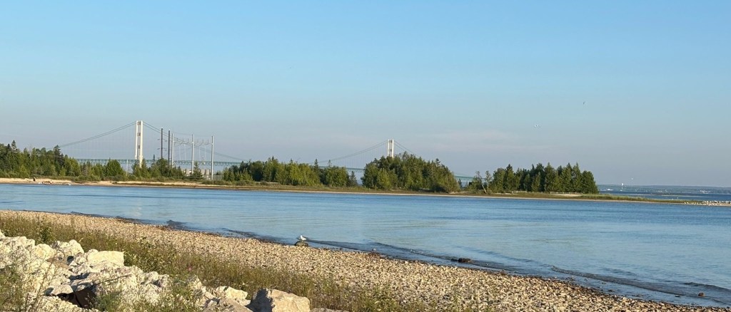 I have been thinking of you and am following your progress. Enjoy the Mackinac Bridge and the views of both Lake Michigan and Lake Huron. Be safe!!